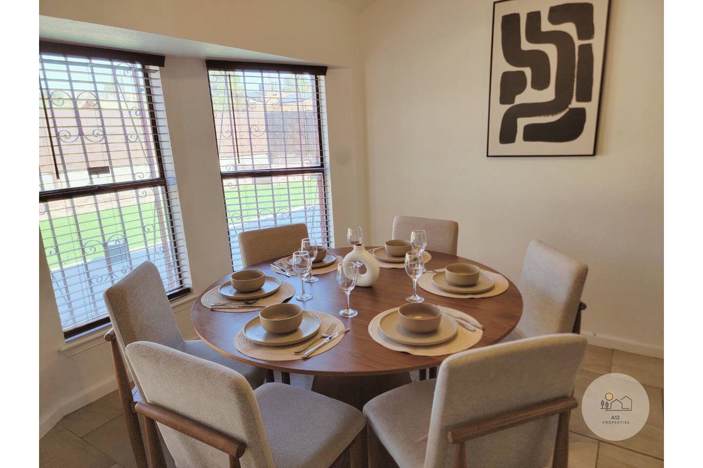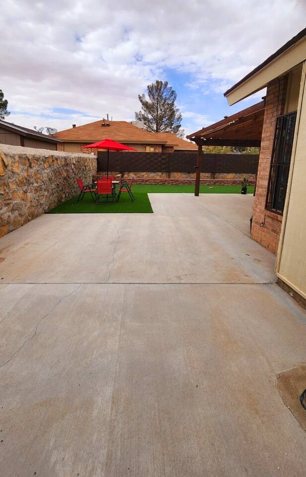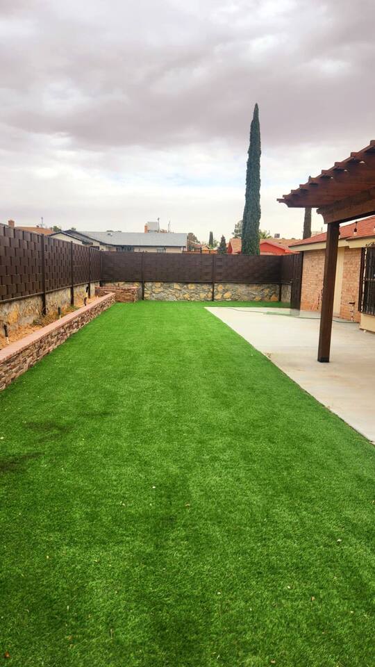 This peaceful home will shelter you in its cozy living room, only 8 miles from the Zaragoza International Bridge, in the heart of East Side El Paso. Hang out in the spacious backyard and enjoy a family dinner in its modern dining room. We offer you: - Fast WiFi -2 car garage -Spacious fenced backyard -Vaulted ceilings with lots of natural light -4k Smart TVs -Washer and Dryer -Shampoo, conditioner & body wash -Fully stocked kitchen We respect our neighborhood. Parties are not allowed.